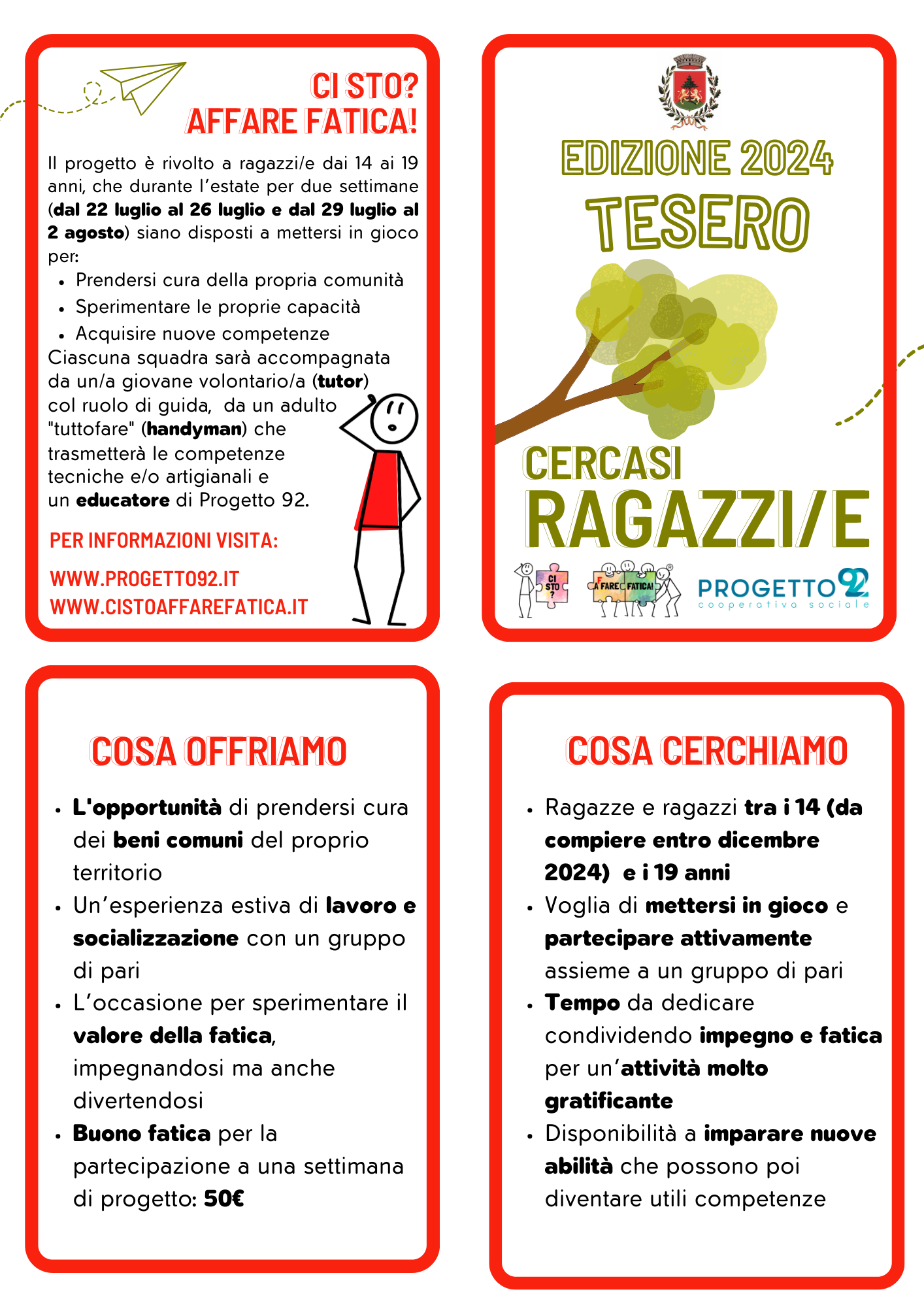 Apriranno mercoledì 15 maggio, alle ore 12.00 e proseguiranno fino al 31 maggio, le iscrizioni per l’edizione 2024 del progetto “Ci sto? Affare fatica!”. Il progetto ospiterà due squadre sul territorio del Comune di Tesero, per un numero di 20 giovani partecipanti